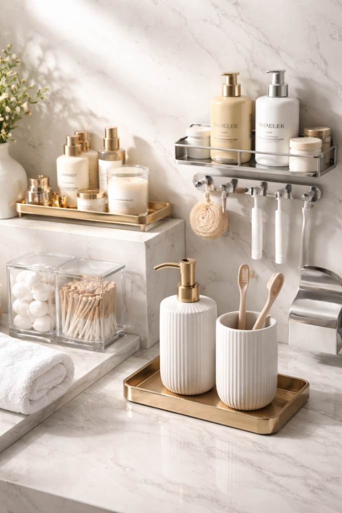 Itens como dispensers de sabonete, organizadores e prateleiras adesivas ajudam a deixar o banheiro com cara de decoração de revista, mesmo quando o investimento é pequeno.